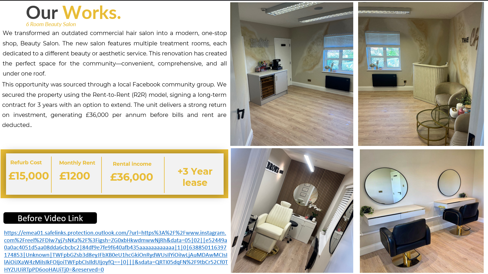 We recently acquired a run-down, outdated salon and converted it into a vibrant, fully refurbished one-stop shop serving the local community. This redevelopment not only revitalized the space but also attracted strong tenant interest and significantly boosted foot traffic in the area.